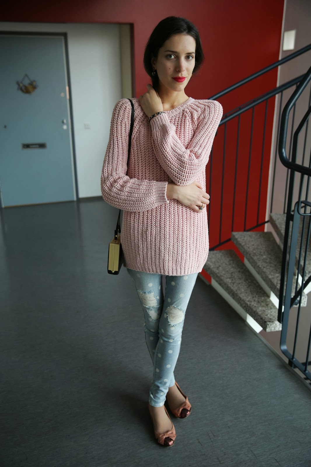 The pink sweater fits so good with the dotted jeans! Great outfit!